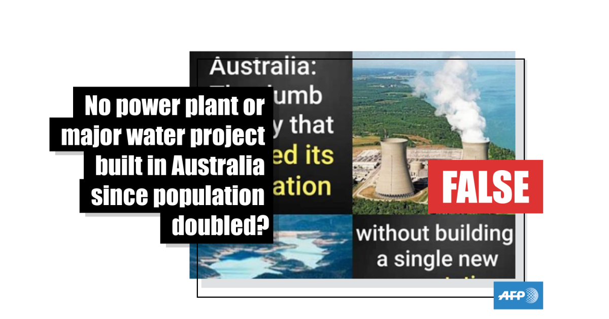 The claim is false; Australia has built power plants and major water projects in the period that the country’s population doubled.