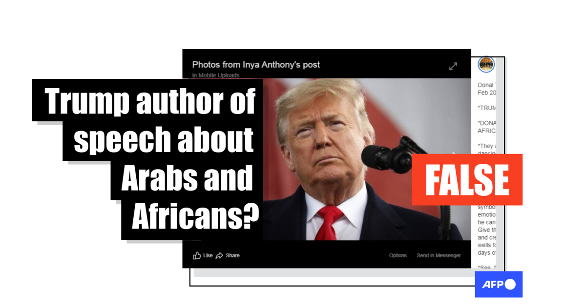 By searching selected paragraphs, AFP Fact Check found a previous version, beginning with another introduction in uppercase letters that reads: “DONALD TRUMP'S SPEECH ON WHY HE HATES AFRICANS & ARABS”.