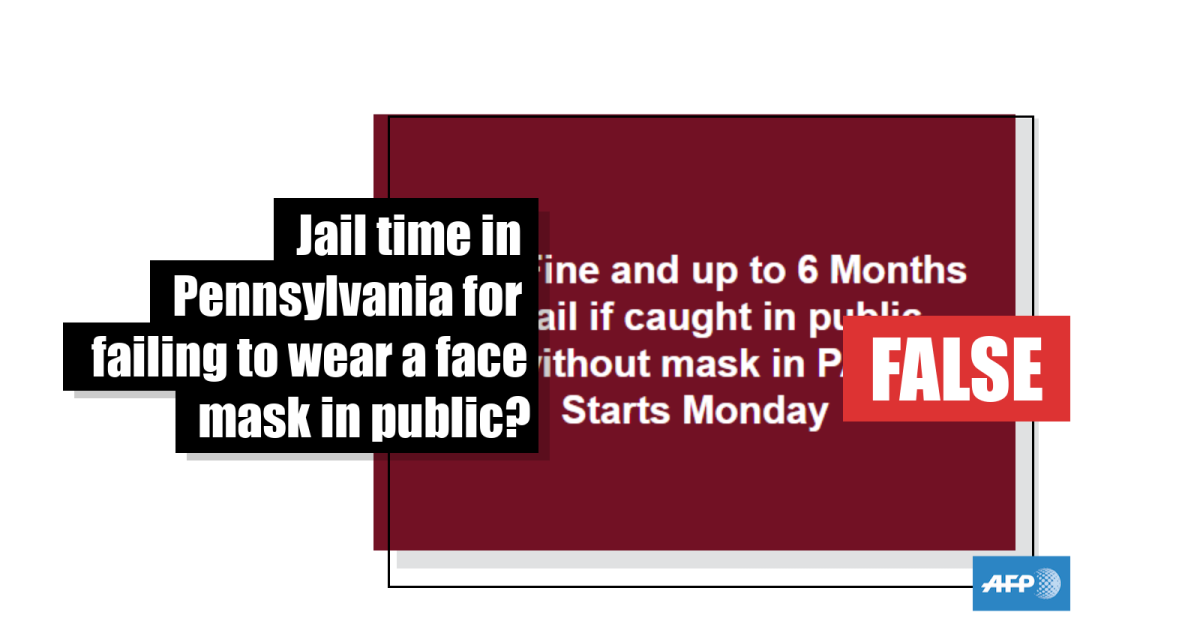 “Pennsylvanians are expected to, and are doing the right thing, and we do not intend to fine or otherwise penalize an individual if they are not wearing a mask, but all are expected to wear a mask if they will be out in public and could interact with any individuals while out,” Nate Wardle, press secretary for Pennsylvania’s health department, told AFP by email.