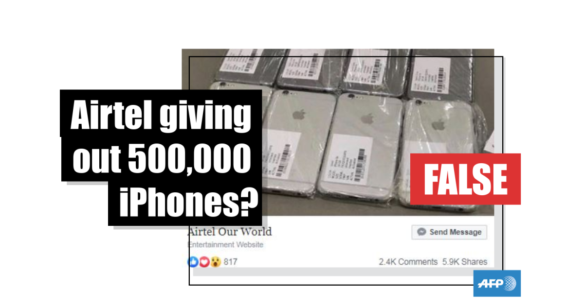 The Facebook post, on a page named “Airtel Our World”, has been shared nearly 6,000 times since it was published on August 1. We’ve archived the post here. It says the company is handing out 500,000 Apple iPhones to Airtel users “to appreciate all their support so far”.