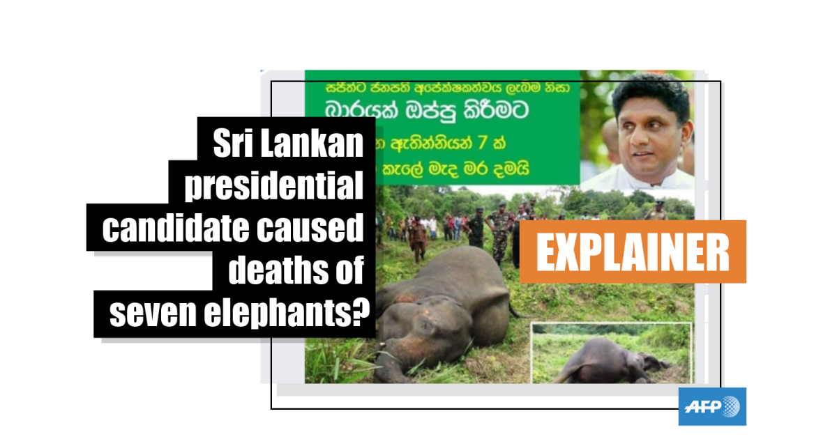 The Sinhala caption alleges Sajith was instructed by a South Indian occultist to make a vow to kill seven female elephants within a day, if he was chosen as the ruling party candidate. The caption goes on to claim the elephant carcasses reveal how Sajith fulfilled his vow upon being selected as the UNP presidential candidate.