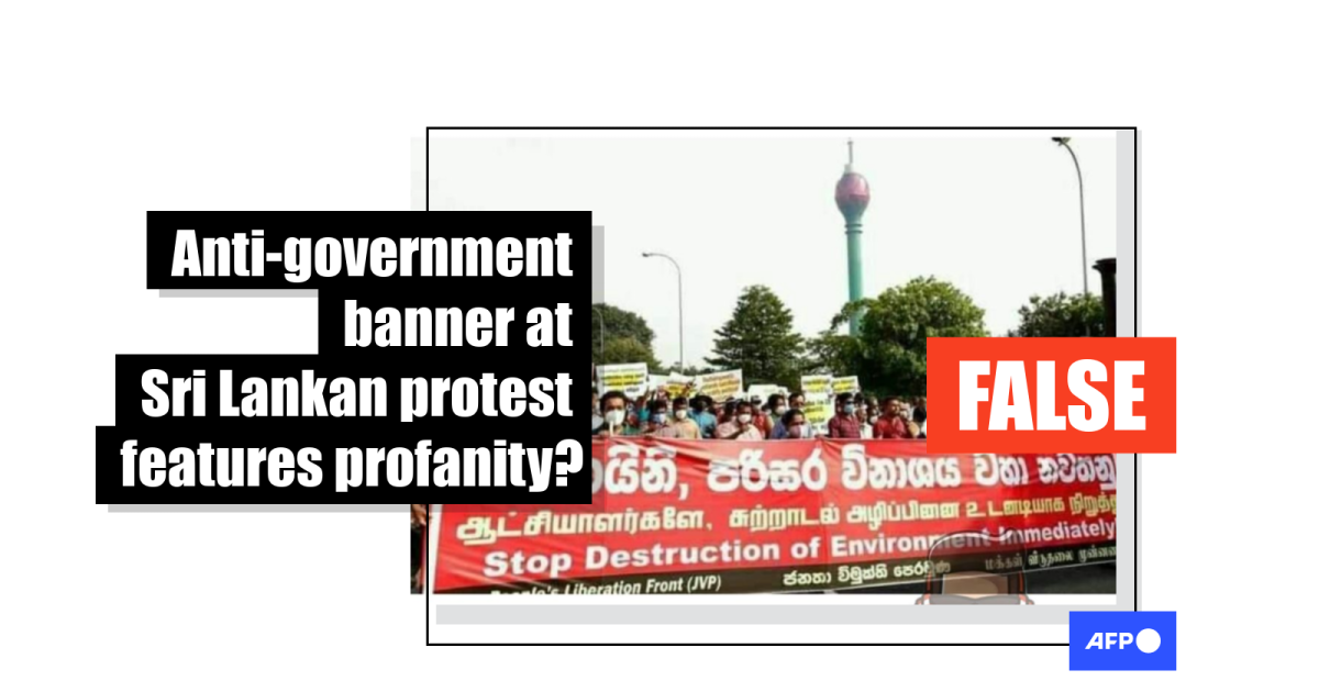 The Sri Lankan protest banner featured in this image has been digitally manipulated