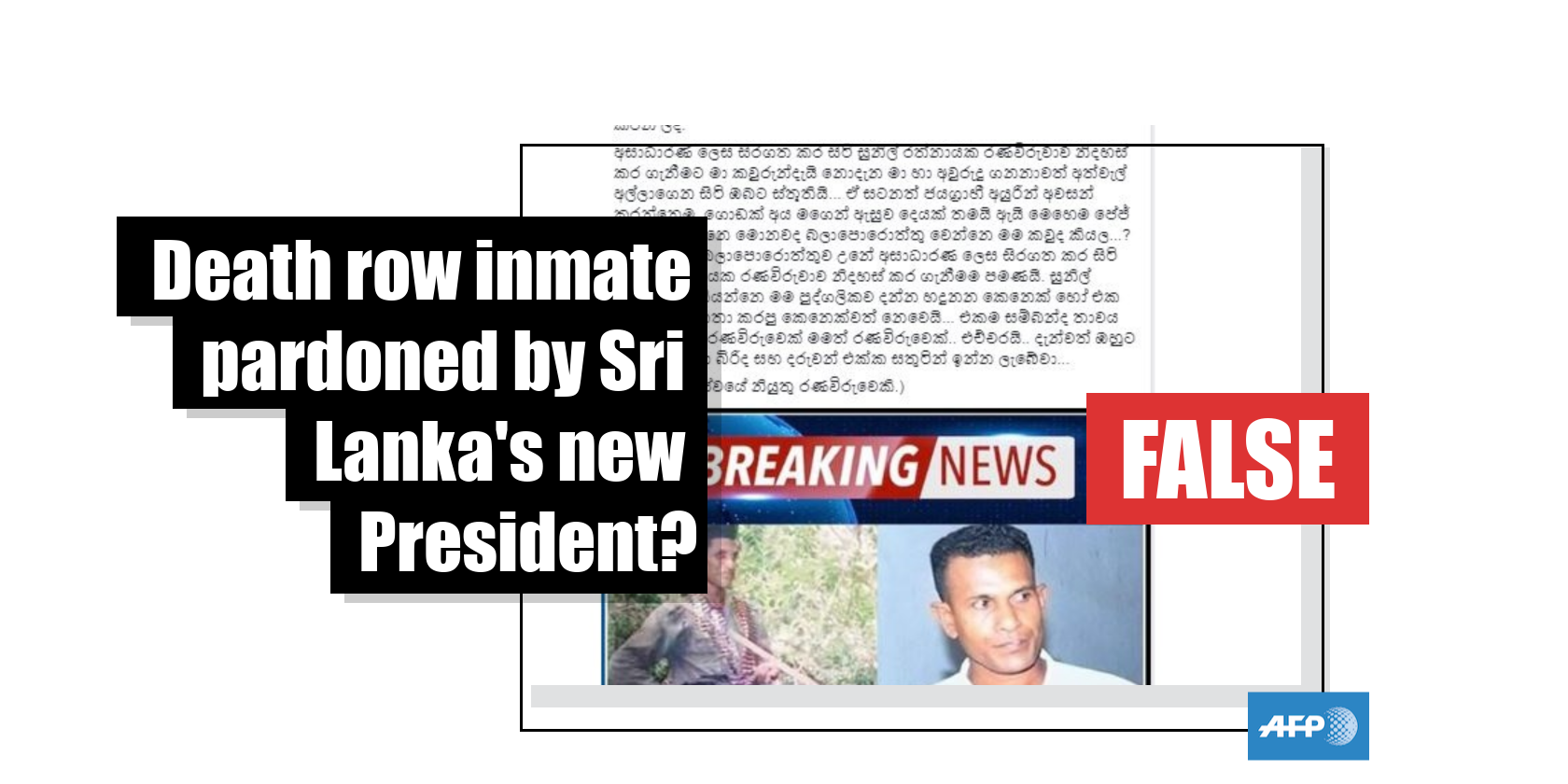 The misleading post’s Sinhala-language caption says: "War hero Sunil Ratnayake was freed a few moments ago by a special order issued by President Gotabaya Rajapaksa".