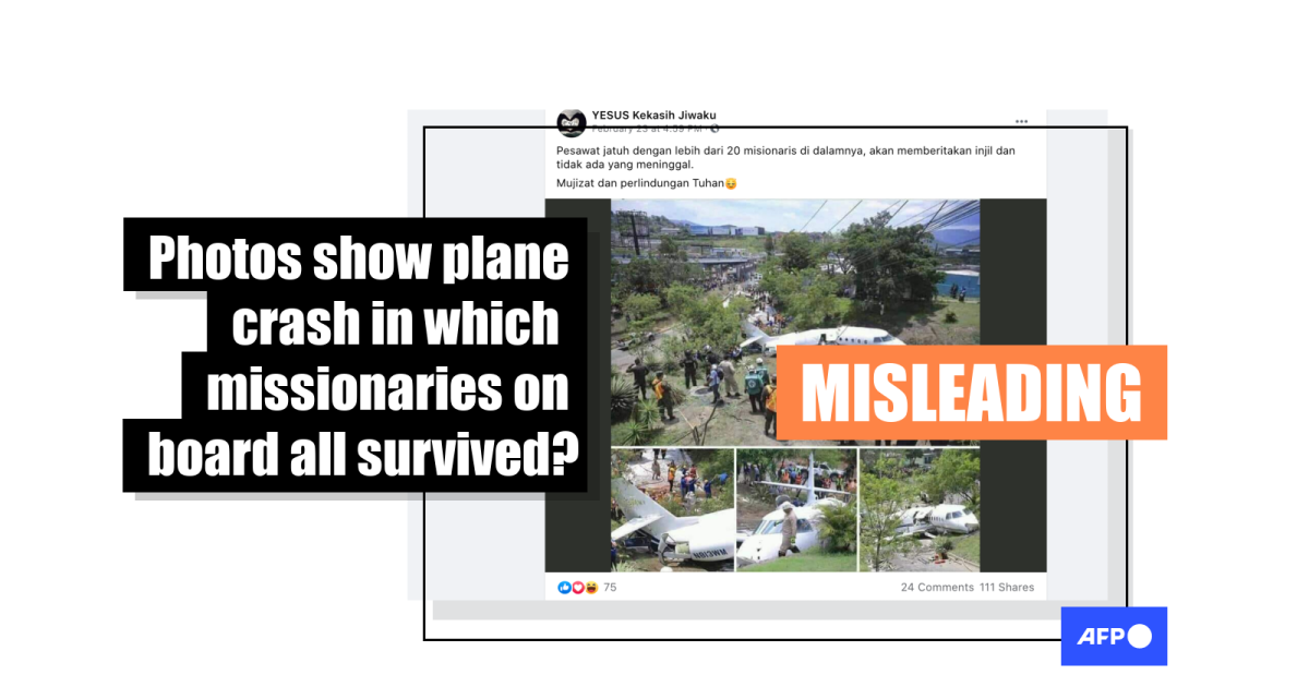The post's Indonesian-language caption translates to English as: “The plane crashed carrying more than 20 missionaries who were going to preach the gospel and no one died.