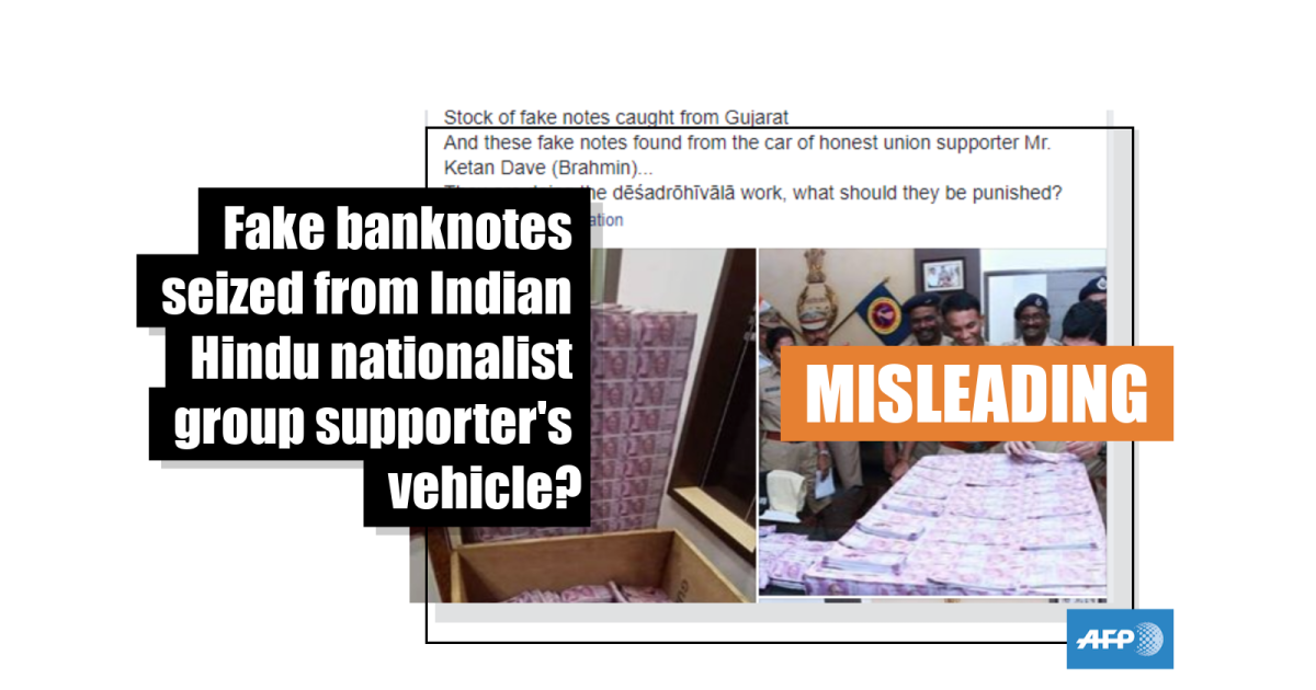 The post’s Hindi-language caption translates to English as: “Stash of fake currency notes is seized in Gujarat from the vehicle and of honest RSS sympathiser Ketan Dave. He is doing anti-national activities and he should be punished.”