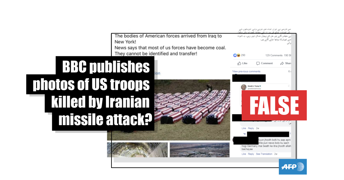 The Facebook post’s Urdu caption translates as: “BBC Persian has published the photos of the coffins of the Americans who died in an attack by Iran. According to it (BBC Persian) some Americans’ (bodies) were totally charred and it was impossible to identify them. These coffins have been sent from Iran to New York. Riffat Wani."
