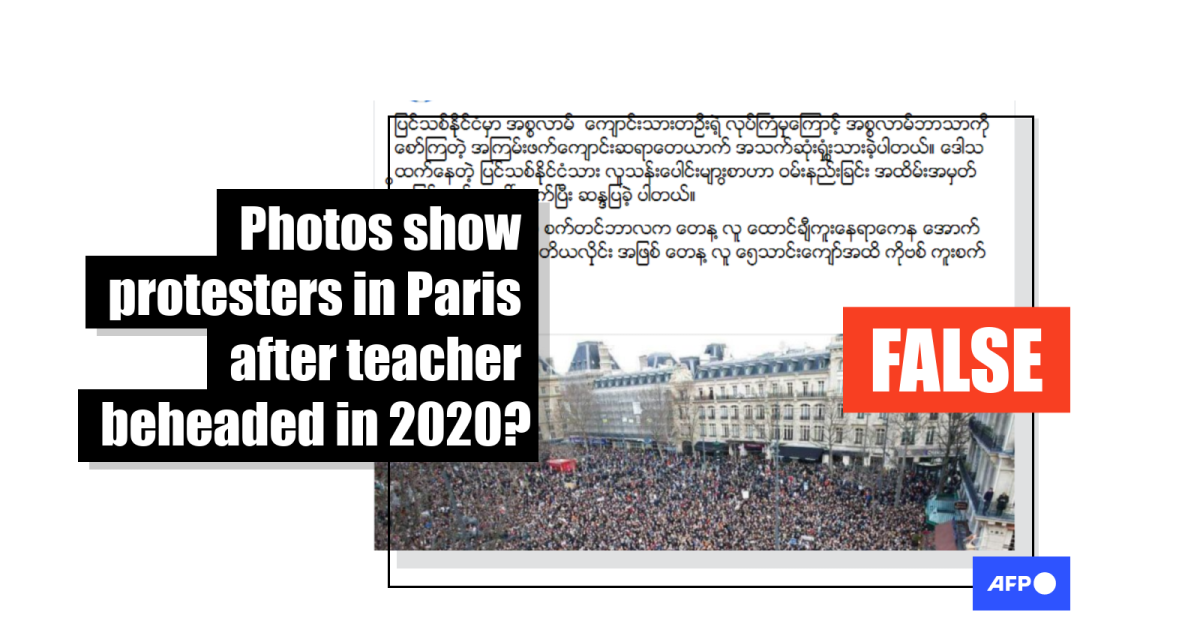 The post’s Burmese-language caption translates to English as: "A teacher has been killed in France by an Islamic extremist student. Millions of angry French gathered in the street and protested to mourn. As a result, the number of (Covid-19) infections increased from thousands in September to more than 50,000 a day in the third wave in October."