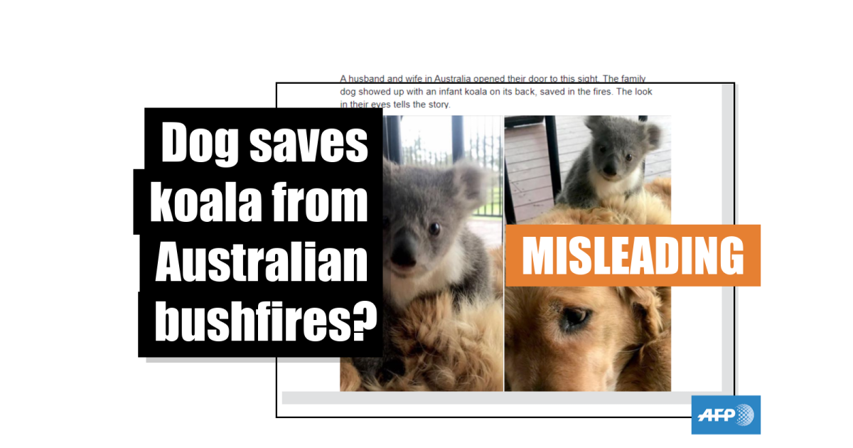 The caption reads in part: “A husband and wife in Australia opened their door to this sight. The family dog showed up with an infant koala on its back, saved in the fires.”
