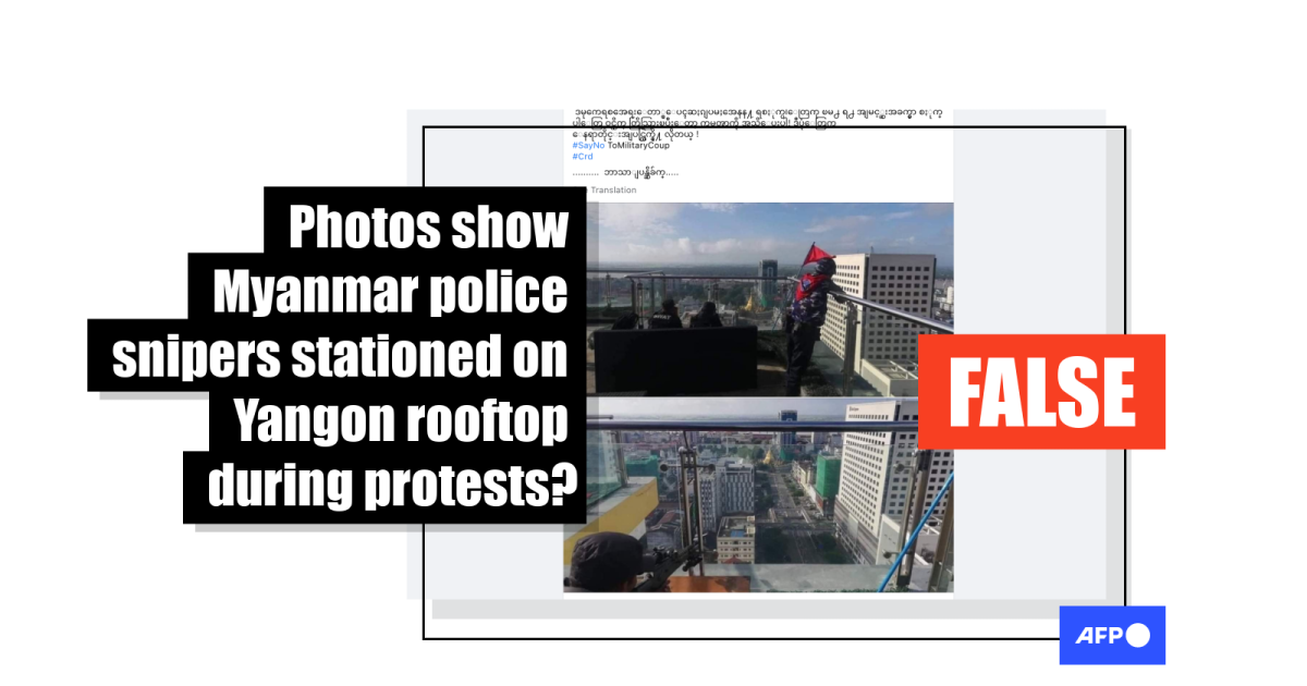 “Police snipers are stationed at the highest points of the city as protest for democracy intensifies,” reads the Burmese-language caption in a misleading Facebook post published on February 8, 2021.