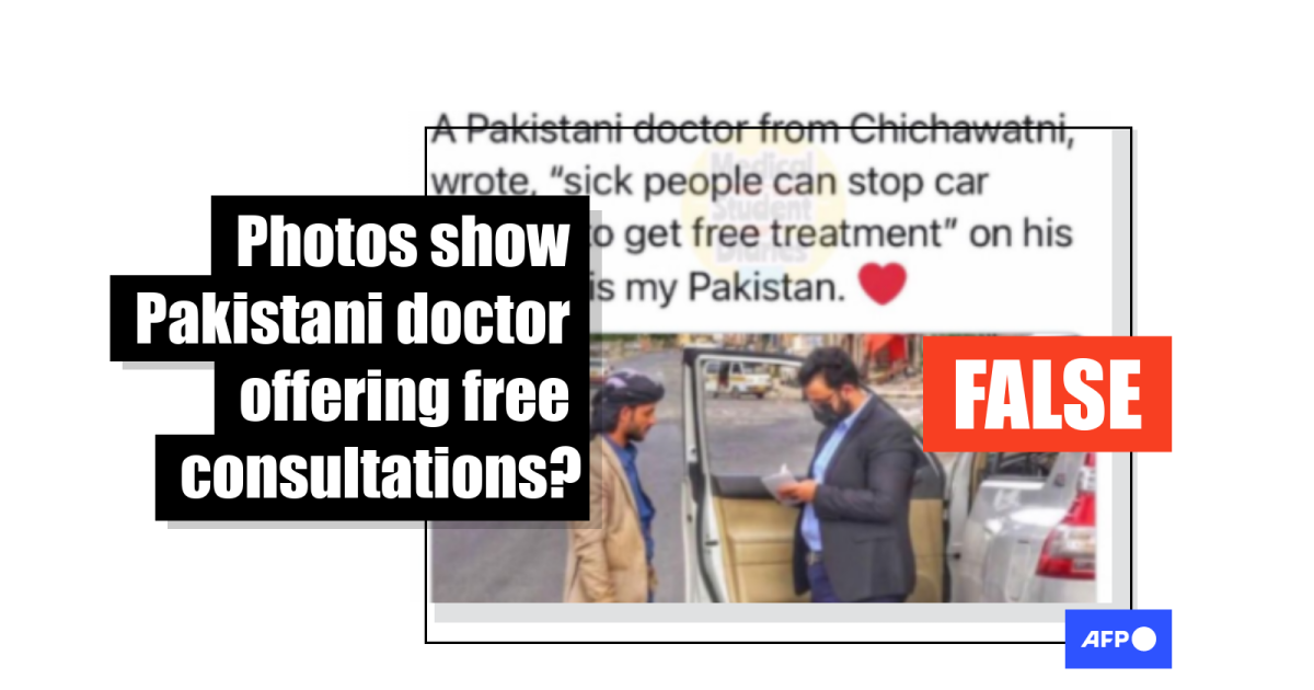 The post shows a screenshot of a tweet that shares the images and reads: “A Pakistani doctor from Chichawatni, wrote, ‘sick people can stop car anytime to get free treatment’ on his car. This is my Pakistan.”
