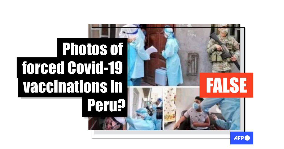 The Indonesian-language text on the photo says: “It is said the vaccine has been distributed door to door in Peru.. ,, if they carried weapons, it meant it was force… let’s pray more and take care, my brothers and sisters…”