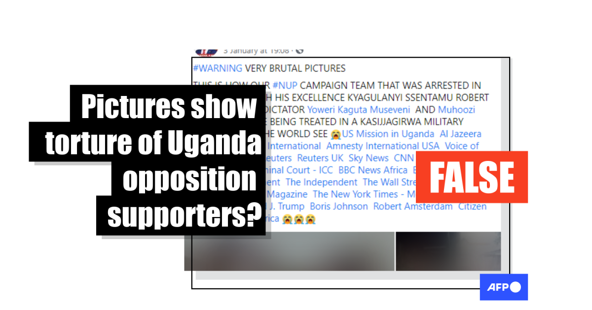 The Facebook post, which tagged major international media organisations, reads: “Warning very brutal pictures. This is how #NUP campaign team that was arrested in Kalangala with his excellency Kyagulanyi Ssentamu Robert on orders of dictator Yoweri Kaguta Museveni and Muhoozi Kainerugaba. Are being treated in a Kasijjagirwa military barracks let the world see (sic).”