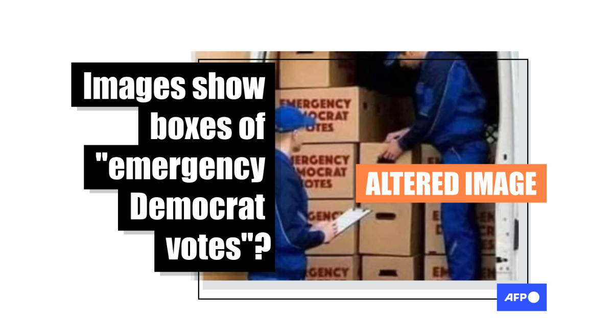 “Let me just drop this right here,” reads a Facebook post circulating in Kenya, along with an image of two men unpacking boxes purportedly inscribed with the words “Emergency Democrat Votes” in reference to the US presidential elections.