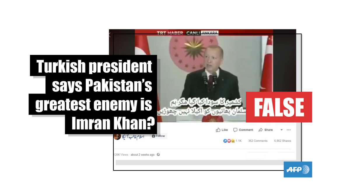 Turkish President Recep Tayyip Erdogan did not say Pakistani Prime Minister Imran Khan was Pakistan’s greatest enemy