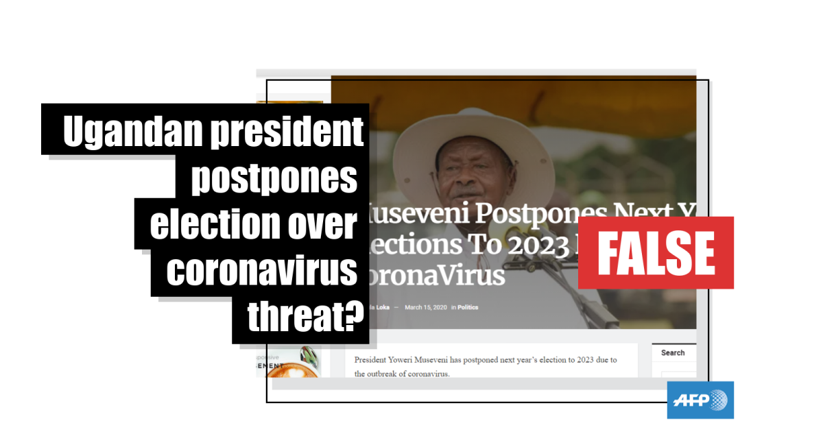 A post on this Kenyan Facebook group with more than two million followers shared a link to the article alongside this text: “President Museveni has postponed next Years Election to 2023 Due to CORONAVIRUS. We cannot Risk the life of millions of people of Uganda we will have our elections in 2023 - Museveni (sic)”.