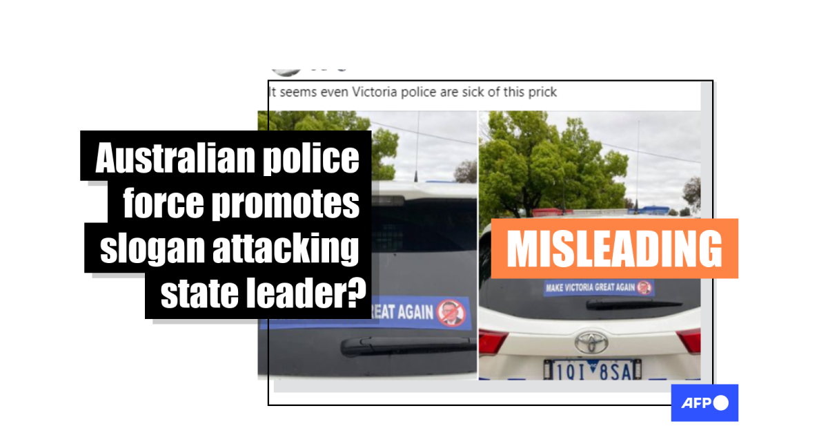 The images purport to show a Victoria Police vehicle bearing a sticker which reads “Make Victoria Great Again” and a crossed out image of the state’s premier, Daniel Andrews.
