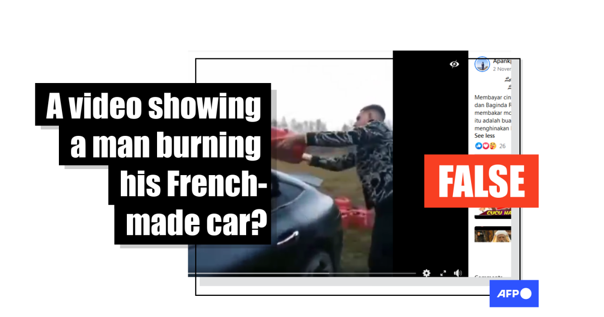 The caption says: “Paying his deep love to Islam and the Prophet, this young man burned his beloved car because the car was made by France, which has insulted the Prophet.”