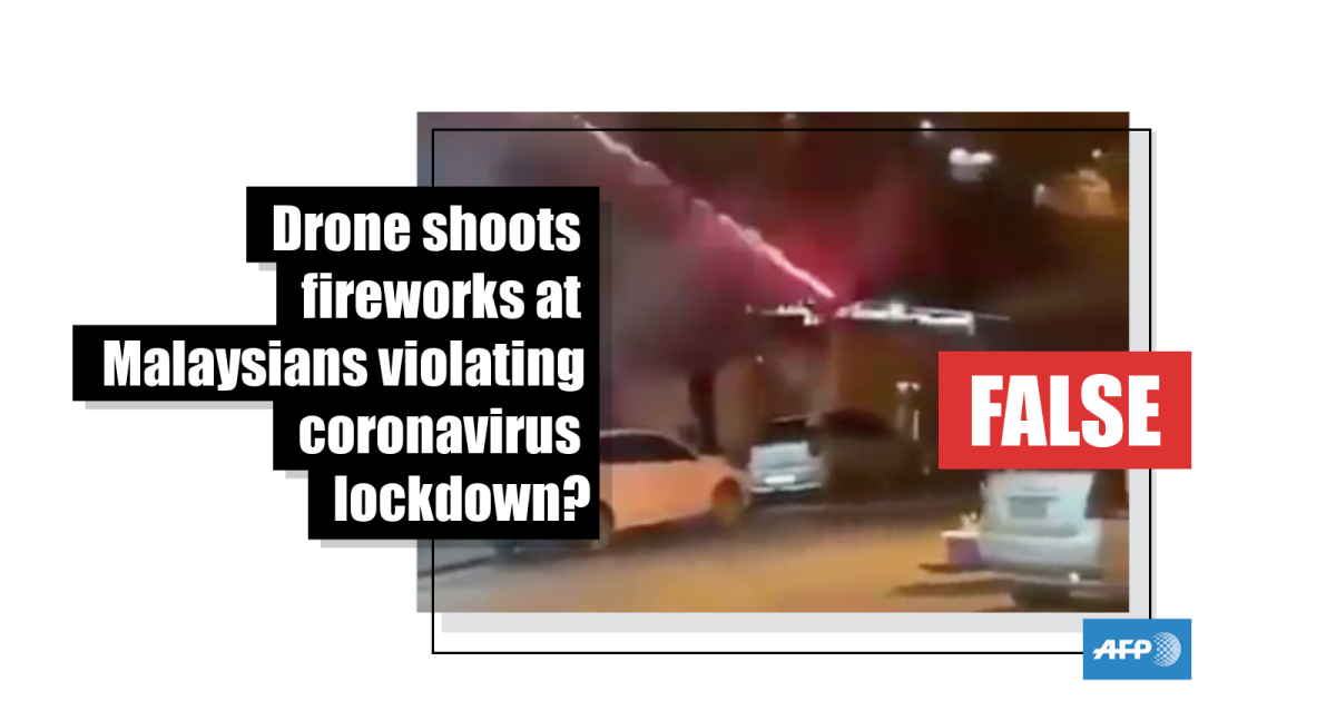 The post's Indonesian-language caption translates to English as: “In Kuala Lumpur those who go outside of their house were shot by fireworks launched by a drone.