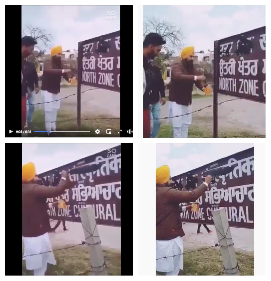 The video's description, written in romanised Punjabi, loosely translates to English as: “Lakha Sidhana, Mota Singh Naiwala blackening sign board for mother tongue Punjabi as first (language).”