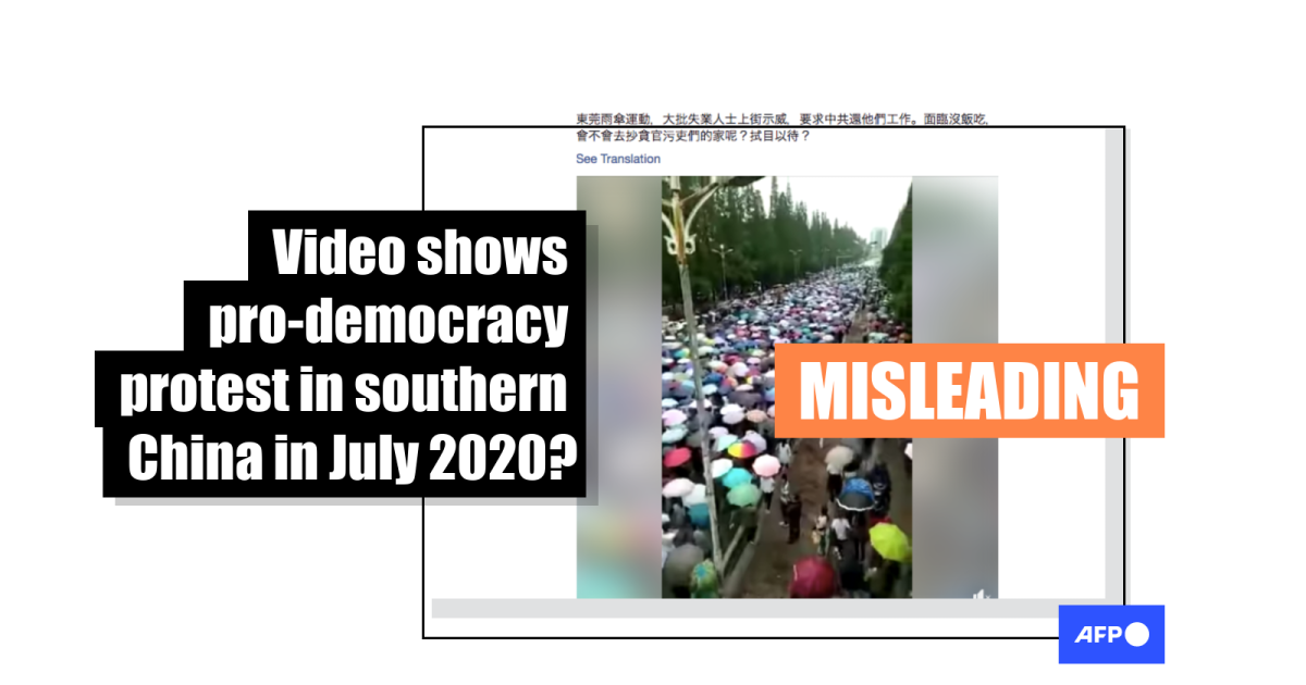 Similar scenes of demonstrators holding umbrellas were featured in reports by US broadcasters Radio Free Asia and New Tang Dynasty Television here and here in June 2016. The reports state that protesters were marching against a proposed pesticide plant in the city of Qianjiang.