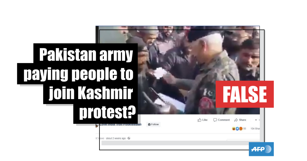 The post’s caption states: “#Pakistan exposed. Pak army distributed money to the protesters of their citizens to Join #KashmirHour.”