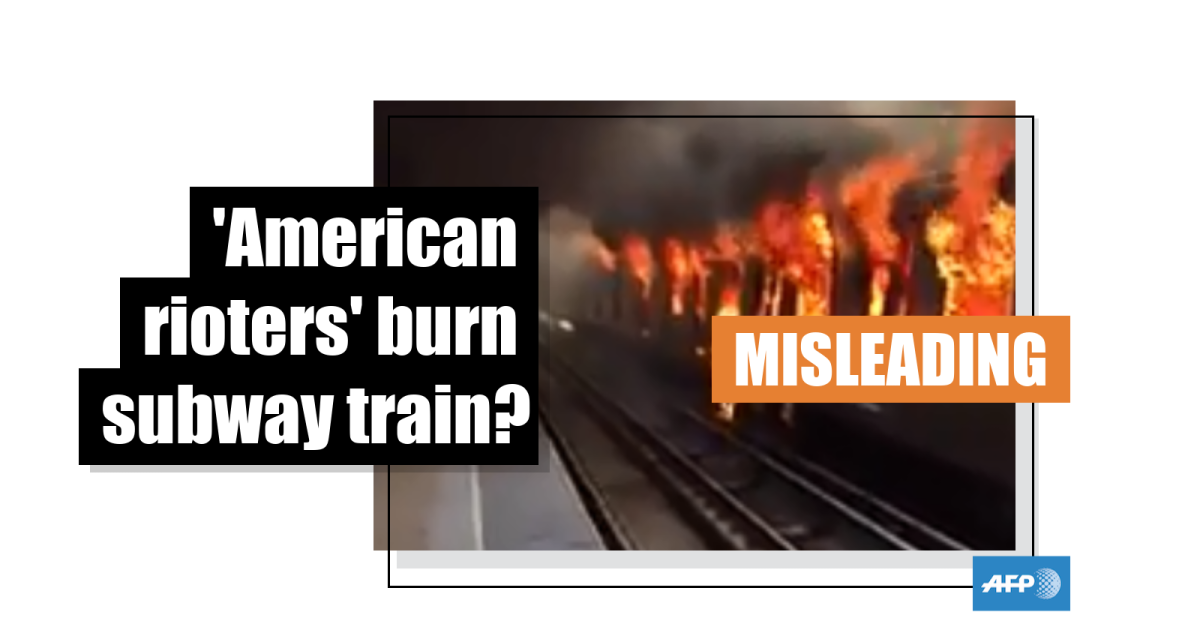 A photo of the burned train was published by AFP here on October 19, 2019. The photo's caption states: "Photo released by Aton of a burnt train after protests in Santiago on October 19, 2019. Chilean President Sebastian Pinera announced Saturday the suspension of the increase in the price of metro tickets which triggered violent protests."