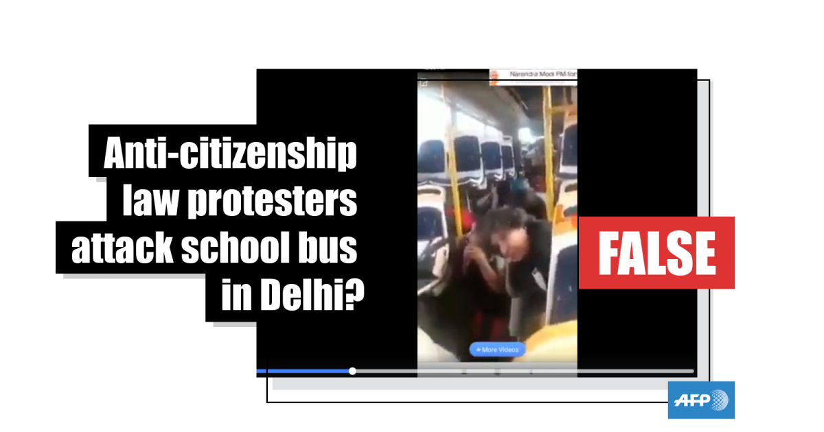 The Hindi-language caption translates to English as: “Bus filled with school children came under attack in Seelampur, stone pelters didn't even spared the school bus filled with children.”