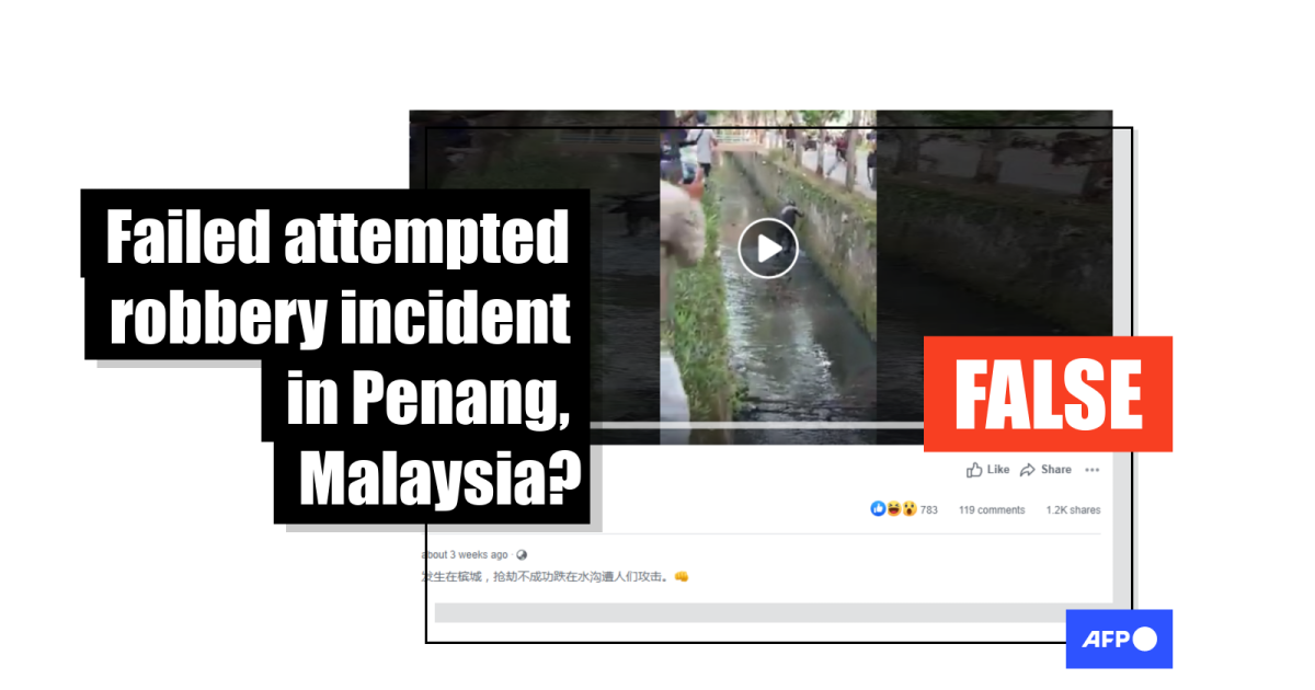 The video’s Indonesian-language caption partly reads: “A suspected robber became a target of the residents’ wrath after he fell into a waterway”.