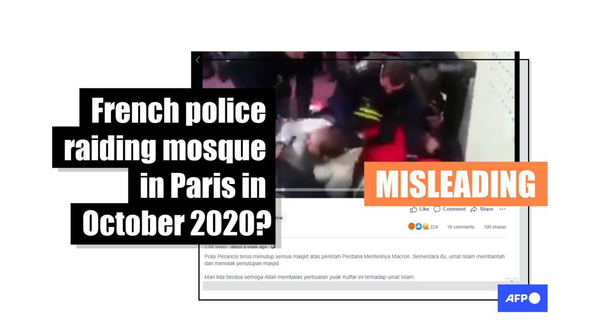 The Malaysian-language caption, translated to English, reads: “French police straightaway closes all mosques on the orders of Prime Minister Macron. Meanwhile, Muslims protested and rejected the closure of the mosque. Let us pray that Allah will repay the deeds of these non-believers against the Muslims.”