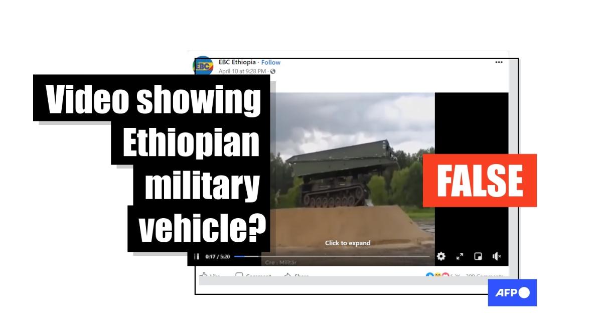 The Facebook post, shared more than 700 times in Ethiopia since April 10, 2021, includes a five-minute video that shows a modern military truck setting up a bridge across two mounds of sand.