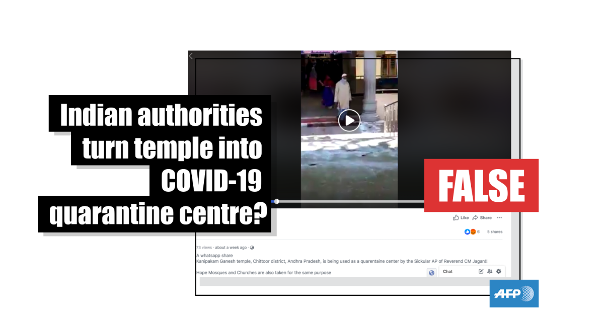 The post’s caption reads: “Kanipakam Ganesh temple, Chittoor district, Andhra Pradesh, is being used as a quarentaine center by the Sickular AP of Reverend CM Jagan!! Hope Mosques and Churches are also taken for the same purpose.”