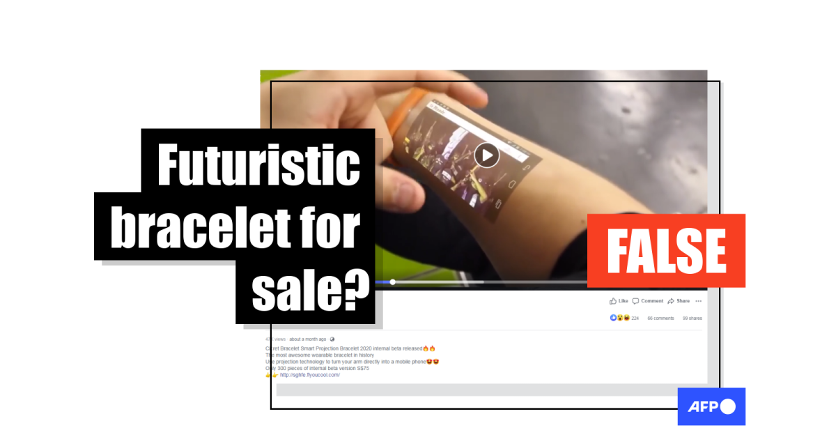 The video shows a person surfing online through a screen projected onto their forearm. It garnered more than 45,000 views on Facebook before it was deleted. The post linked to a website advertising the bracelet for S$75 (56 USD) that can still be found here.