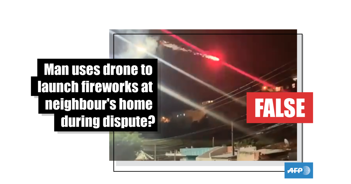 The 33-second video shows an airborne drone launching fireworks at a narrow street, while onlookers duck for cover.