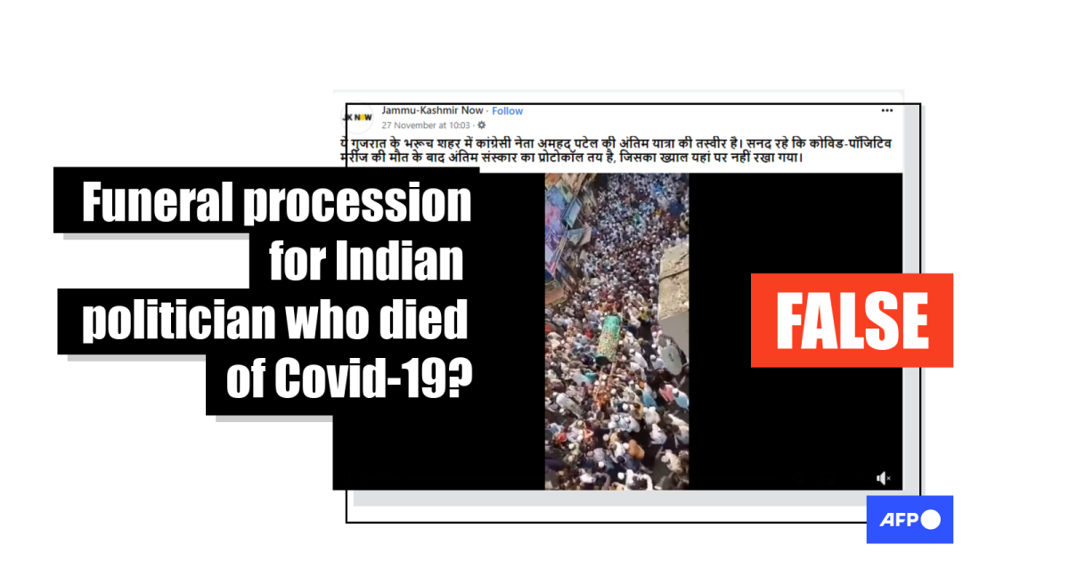 The post’s Hindi-language caption translates to English as: “This video shows the funeral procession of Congress leader Ahmad Patel in Gujarat's Bharuch city. It should be noted that there is a protocol in place for the last rites of a person who died of COVID-19, but that guidelines are not being followed here.”