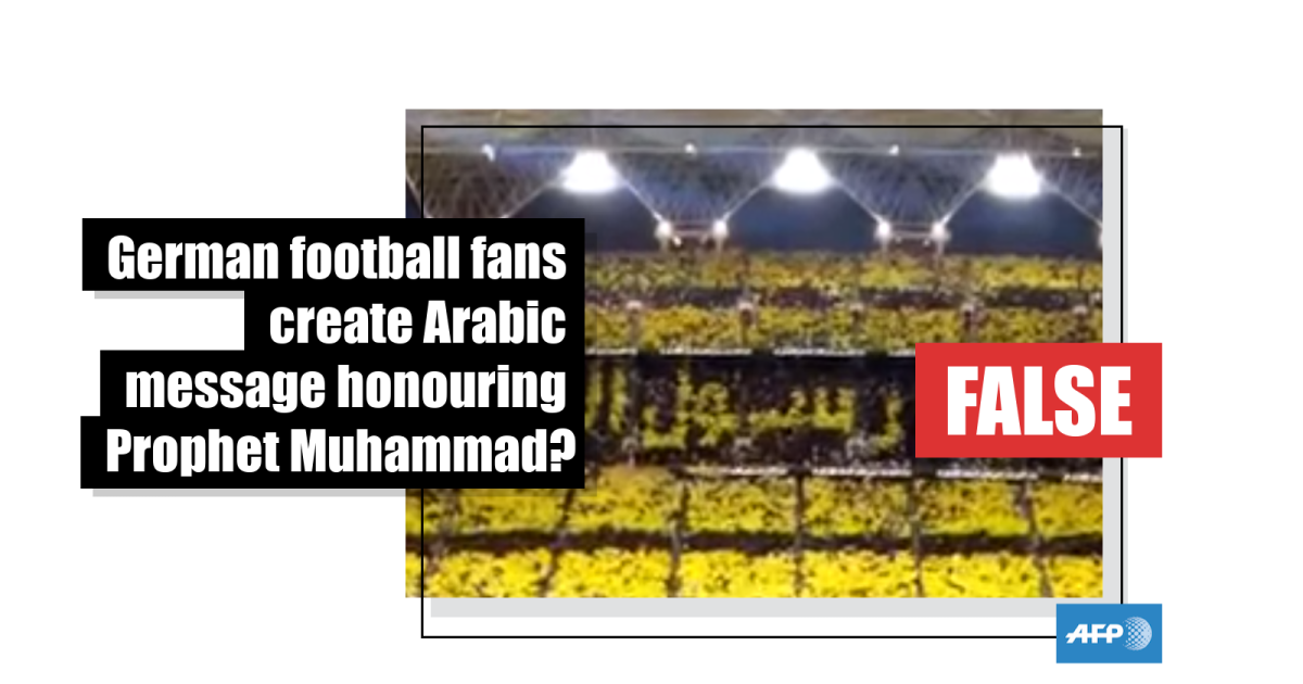 An Arabic-speaking AFP journalist analysed the footage. The Arabic letters formed by the spectators translate to English as: “Dear Prophet Messenger of God.”