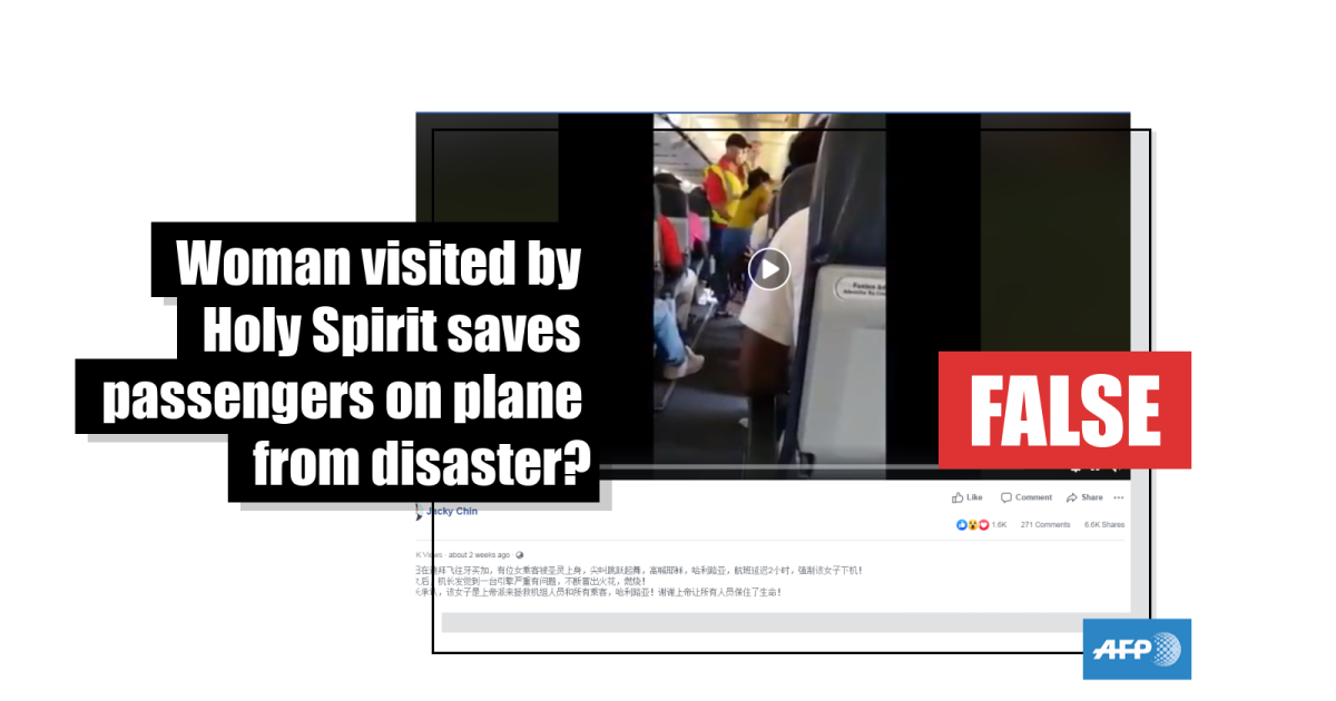 The caption, written in traditional Chinese characters, translates to English as: “Recently, a female passenger was lifted up by the Holy Spirit, screaming, dancing and shouting Jesus and Hallelujah when she flew from Dubai to Jamaica. The flight was delayed for 2 hours, and the female was forced to get off the plane!