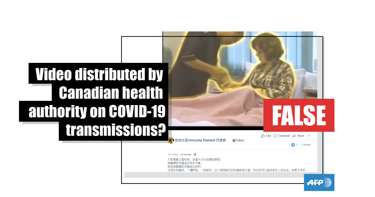 The video’s simplified Chinese-language caption translates to English as: “Everyone take a look at the video above, see how quick the simulated transmission of the novel coronavirus filmed by Canadian CDC can be./Information about simulated novel coronavirus transmission./That's so quick, one will be infected right after contact, the video is very valuable, and can save many people's lives if widely spread, and prevent while we’re still safe…/So terrifying…I'm scared”.