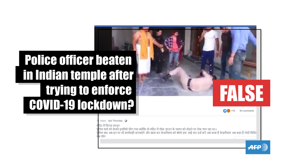 The post’s Hindi caption translates to English as: “The law is being thrashed inside a temple. The policeman was assaulted only because he was enforcing lockdown inside a temple. Will the police take action against them as well? Where is Kejriwal now, he should lodge an FIR at least. Where is the media, where is everyone now?"